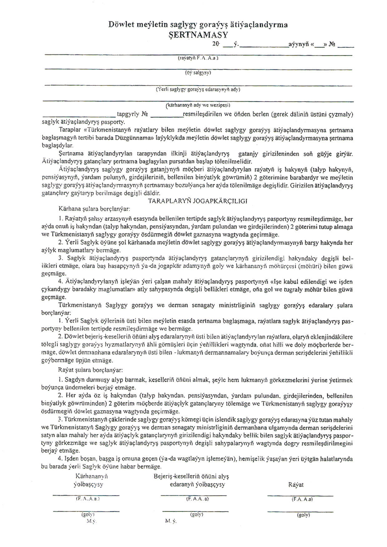 Şertnama 3 ekzemplýarda resmileşdirilýär. Onuň bir ekzemplýary ätiýaçlandyryş şertnamasyny baglaşan raýatda, ikinji ekzemplýary edarada (kärhanada), üçünji ekzemplýary bolsa ýerli Saglyk öýünde saklanylýar.