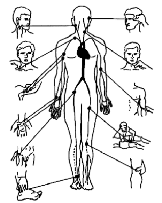Güýçli arterial we gatyşyk gan akmalarda daňy goýmak ýeterlik däldir. Şeýle ýagdaýlarda arteriýany barmak bilen gysmak, gan saklaýjy žguty goýmak, eli-aýagy epip saklamak ýaly çäreler ulanylýar. Ýaralanan arteriýadan ýokarsyny basyp durmak has elýeterli usuldyr. Onuň üçin arteriýany süňklere gysyp boljak nokatlary bilmek möhümdir. Ol ýerlerde damar urgyny tapyp bolýar. Barmak ýa-da ýumruk bilen arteriýany gysmak netijesinde gan akmany çalt saklap bolýar. Ýöne iň türgen adam hem uzak wagt şol bir nokady gyzyp saklamakdan ýadar.