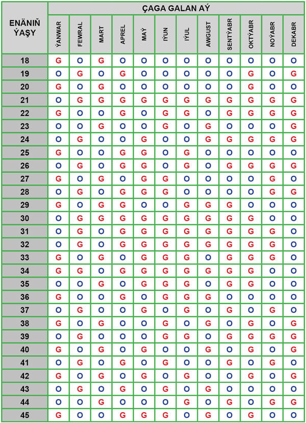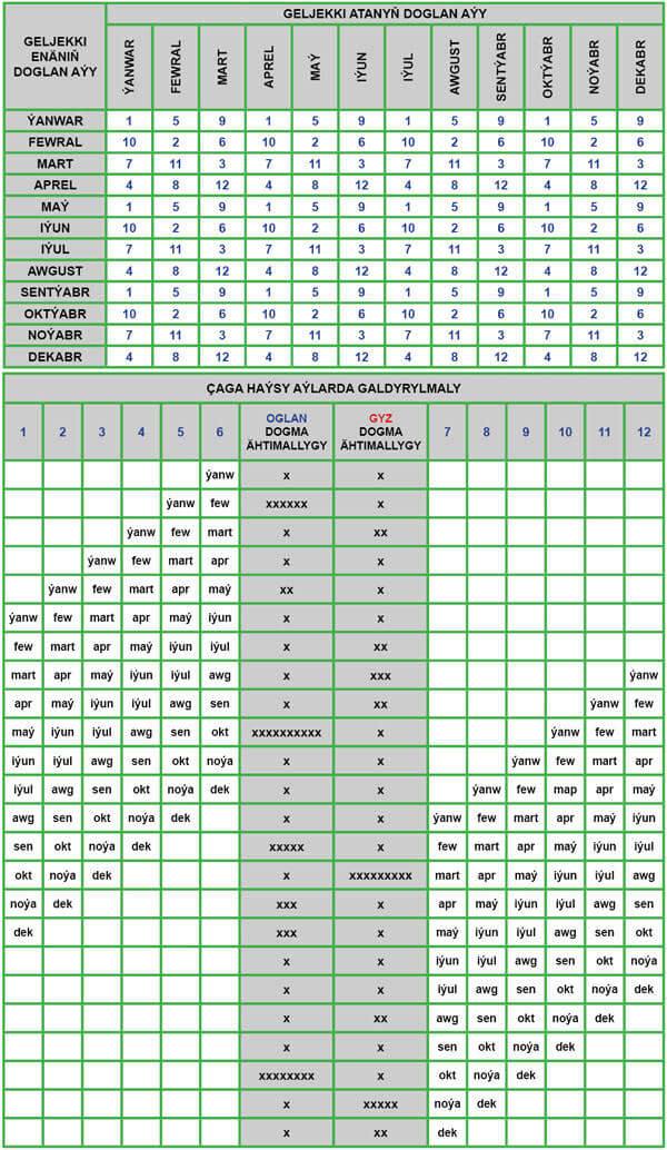 Çaganyň jynsy saýlananda gadymy hytaý tablisasyndan hem peýdalanýarlar. Tablisanyň çep tarapyndan öz ýaşyňyzy, sagyndan çagany meýilleşdirýän aýyňyzy tapyp, olaryň kesişýän öýjügine seredýärsiňiz.